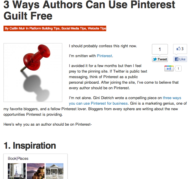 Pinterest for authors has been a hot topic these days, and the well respected Author Media group posted 3 Ways Authors can use Pinterest Guilt-Free.