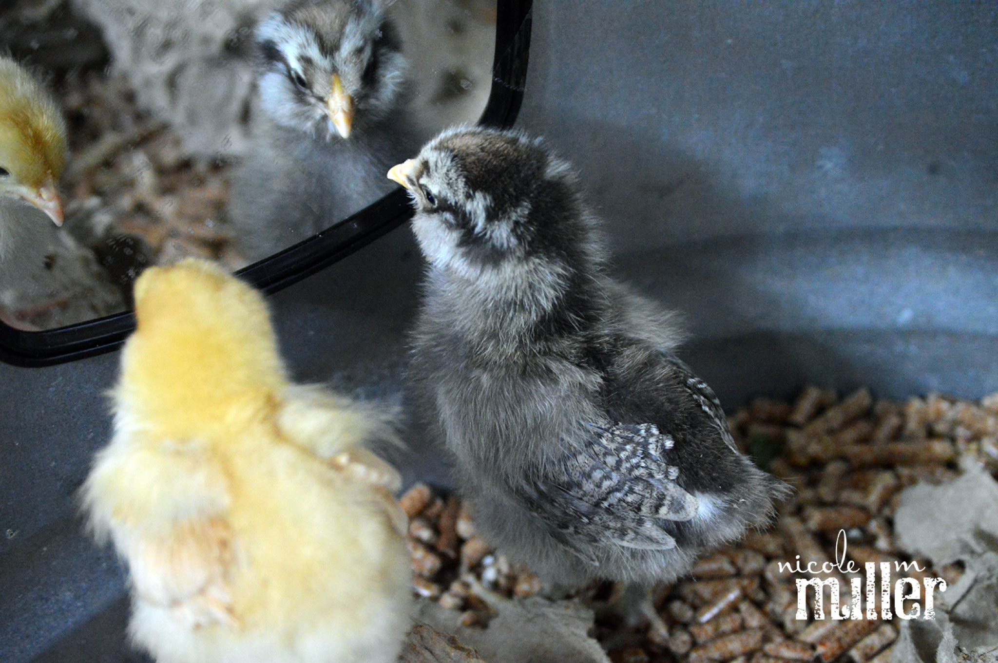 To combat brooder boredom, we also put a mirror in their cage, and the chicks are quite enamored with it. (Or should I say, with themselves?)