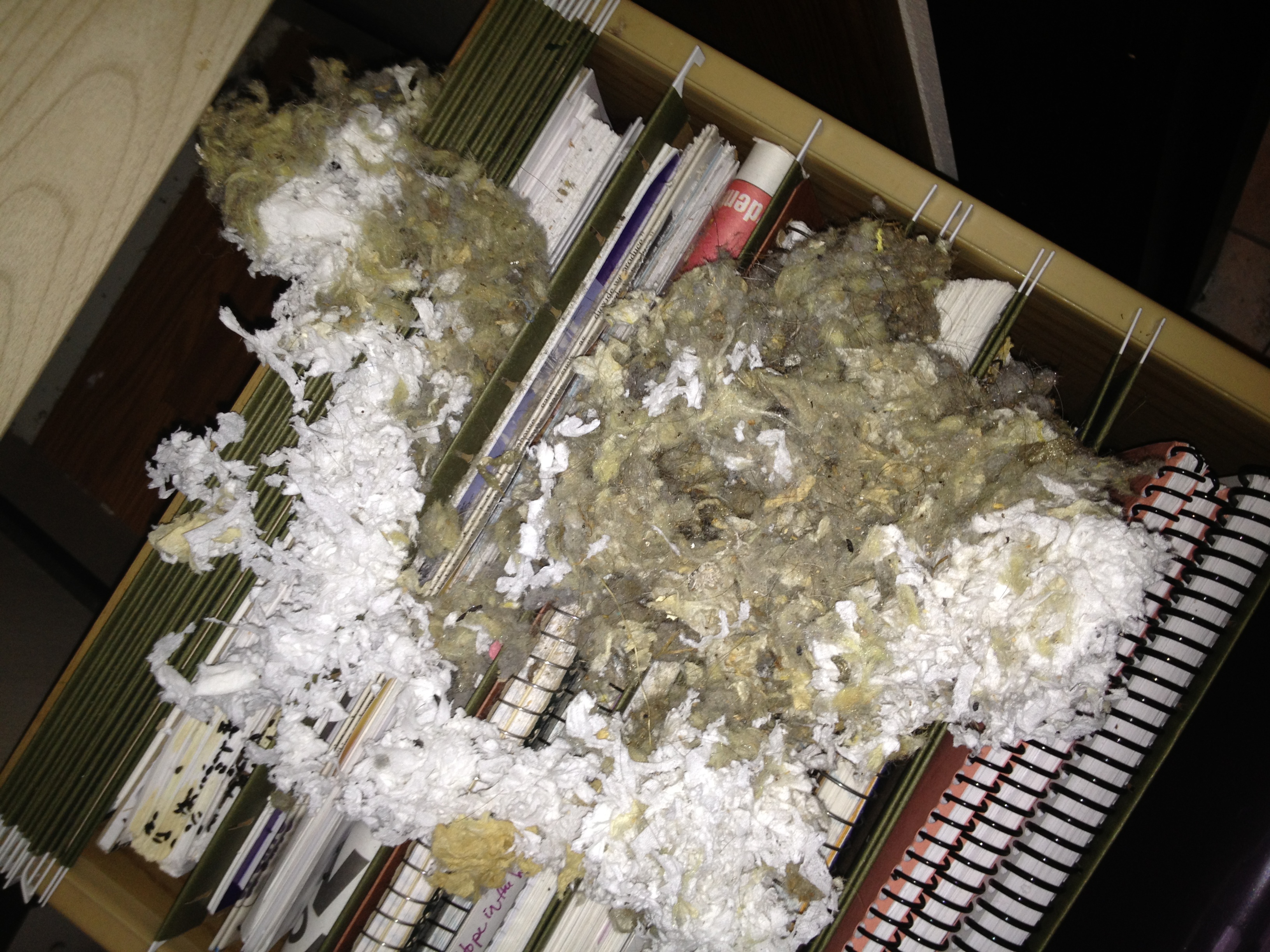 That rotten mouse had burrowed into a filing cabinet. A filing cabinet! This particular drawer housed my clips from college and all my hand-written stories and novels I’d written in high school. Apparently, the mouse wasn’t fond of my writing.